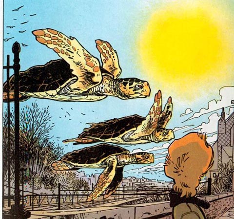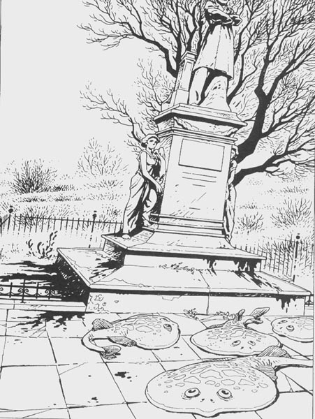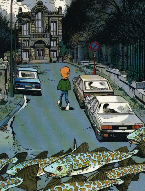Notez que la statue en noir et blanc est un dessin que l'on trouve à la fin de l'album "Les baleines publiques" (collection Repérages). La statue que Broussaille voit en rêve est légèrement différente, mais l'influence est néanmoins très nette...